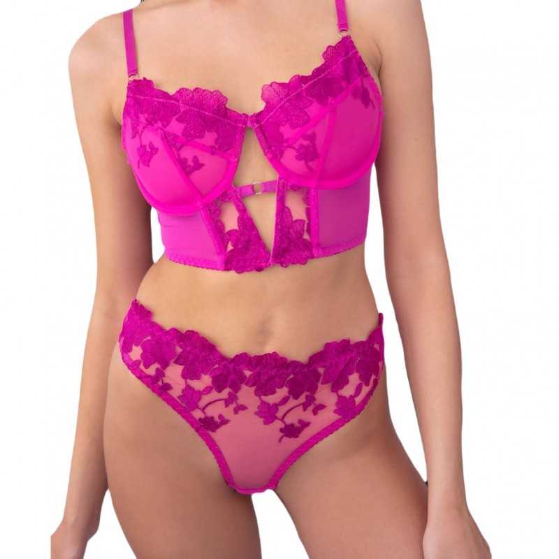 Γυναικέιο Σετ Εσωρούχων Μπουστάκι και String με διαφάνεια κεντημένα λουλούδια σε Μωβ χρώμα